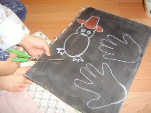 Today we're going to make a bat mask and a bat candy bag using your hands.We need some black paper, white crayon, sissors and glue. First draw your hands with white crayon on the black paper.Now draw bat's body, face, two ears, two feet and sharp teeth.And then cut out them.Your hands will be the bat's wings.Now glue two your hands onto the bat's body.Wow...very good job...!! This time let's candy bag.Draw two eyes and cut it out.And draw bat's teeth onto paper cup.Put two eyes like this.And glue your hands and put together. We did it...~!
