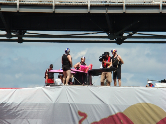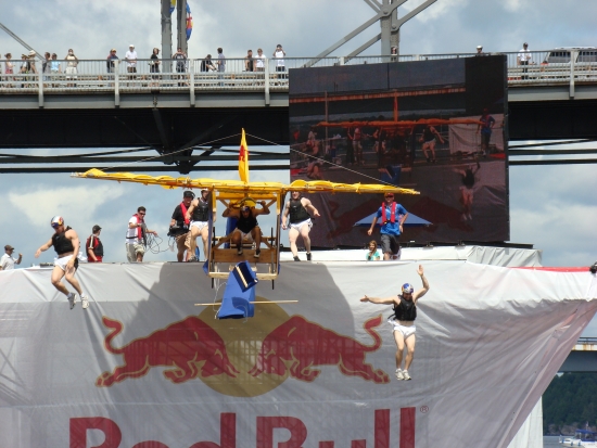 Red Bull Flugtag challenges teams of everyday people to build homemade, human-powered flying machines and pilot them off a 6.7 metres (22 feet) high deck in hopes of achieving flight! Flugtag may mean "flying day" in German, but all these crafts ultimately splash into the waters below. They are judged not only on their flight's distance, but creativity and showmanship as well.
