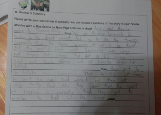Monday with a Mad Genius by Mary Pope Osborne is about a brother and sister named Jack and Annie going to Florence, Italy to help Leonardo da Vinci all day long, so they could find the second happiness for Merlin. First, they went to Florence, but they couldn¡¯t find Leonardo. They used the Wand of Dianthus to find Leonardo. Then they met Leonardo and asked if they could help him. he said ¡°Yes¡±. Then, he took them to a place he drew a fresco. The fresco didn¡¯t dry, because Leonardo used a paint that doesn¡¯t dry easily, which Leonardo invented. Leonardo tried to dry it by putting fire close to it, but it melted. Leonardo was disappointed and furious. So he went home, leaving Jack and Annie behind. When they went to Leonardo¡¯s house, Leonardo shouted at them why they are there. But Annie helped him calm down. Then, he led them to his studio. Then, they talked about flying, and stuff like that. After that, Leonardo tried his ¡®the great bird¡¯. But he failed. So, Annie used the wand of Dianthus to make her, Jack and Leonardo fly like birds. Soon they flew across the sky. Then, they followed Leonardo going to draw Mona Lisa. Lisa didn¡¯t smile because she was afraid if she smiled and da Vinci finished her picture, he would sell it to her family and never think of her again. However Leonardo promised that he would not sell her picture and always take it wherever he goes. So, Lisa smiled. Leonardo said to Jack and Annie that the secret of happiness is curiosity. After that, they went back to Frog Creek. That¡¯s how the story ends. I love this story!