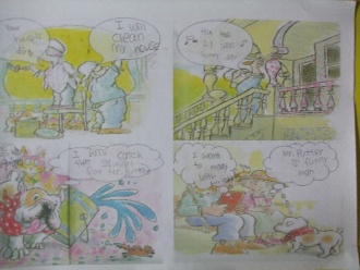 Now, Mr.Putter think the pink is right color to his porch. So he bought pink paint.Then he paint and paint the porch.He thought pink was so beautiful, he made the color very pink.
