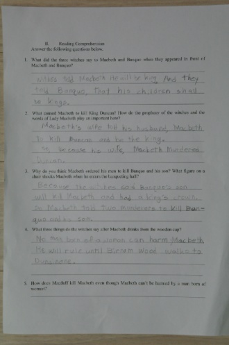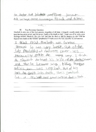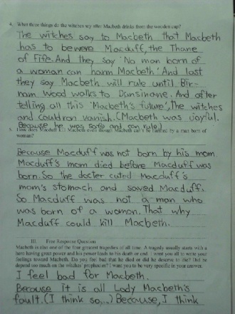 Macbeth is also one of the four greatest tragedies of all time. A tragedy usually starts with a hero having great power and his power leads to his death or end. I want you all to write your feelings toward Macbeth. Do you feel bad that he died or did he deserve to die? Did he depend too much on the witches¡¯ prophecies? I want you to be very specific in your answer.