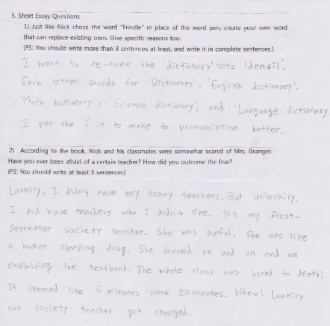 2)Yes. I have been afraid of my teacher. Who? My homeroom teacher, this year. Do you know why I was afraid of her? I have to write question and answer three times if I am wrong in test. Except for semester's middle test and final test. I am afraid because I don't know how many tests I will have in one day. I had 6 tests in one day before!