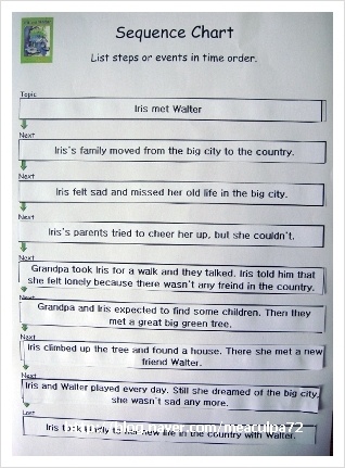 Topic : Moving to the country first event : Iris moved to the country. next : Iris thought there would be no children in country and missed the city and her old life. next : Her mom tried to cheer her up but that didn't work. next : Her dad tried to cheer her up but he failed too. next : Her grandpa didn't say "cheer up". Instead, He and Iris took a wallk along path. next : Around the bend, someone was waiting in his tree house. It was Walter.