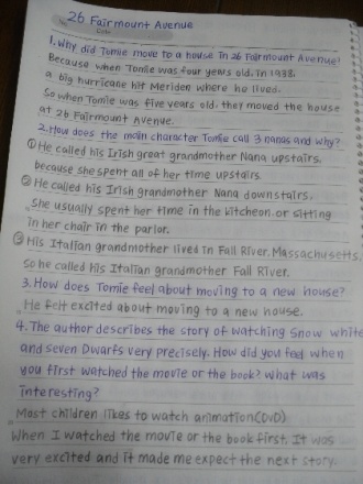 There was an enormous hurricane where Tomie lived. After the hurricane disappeared Tomie¡¯s house was a mess. Trees were lying every where. The year 1938 was the special year to Tomie. It was the year that the huge hurricane destroyed Tomie¡¯s home and it was also a year that Tomie¡¯s family started to build 26 Fairmount Avenue.