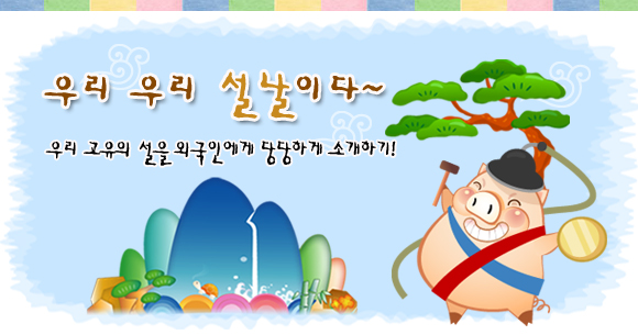 | ¾îÈÖ | ¿µ¾î | | ¼³³¯ | New Year¡¯s Day or Korean¡¯s Happy New Year | | Àú°í¸® | Korean jacket | | ¶±±¹ | Rice-cake soup | | ¼¼¹îµ· | The New Year¡¯s gift of money | | Â÷·Ê | Ancestor-memorial services | | µ¡¹ö¼± | Outer socks | | °í¹«½Å | Rubber shoes | | ÆØÀÌÄ¡±â | Top spinning | | º¹ÁÖ¸Ó´Ï | Lucky bag |