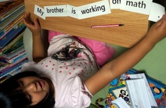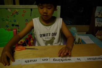 #57 My brother is working on math.